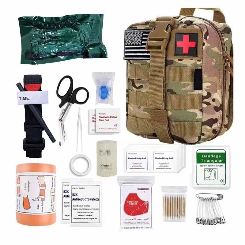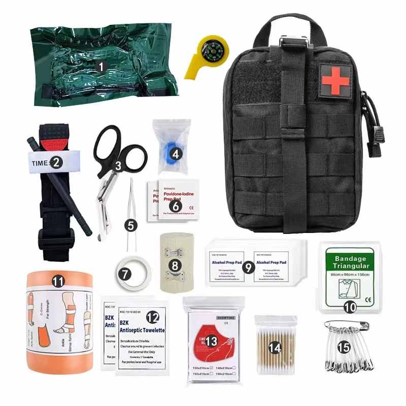 The bag contains Israeli Bandage, CAT Tourniquet, Gauze Scissors, First Aid Mask, Metal Tweezers, Medical Adhesive Tape, Wrinkle Bandage, Alcohol Sheet, Triangle Bandage, Fixed Splint, BZK Antiseptic Swab, First Aid Blanket, Cotton Swab, Whistle Compass and Iodophor Tablet.